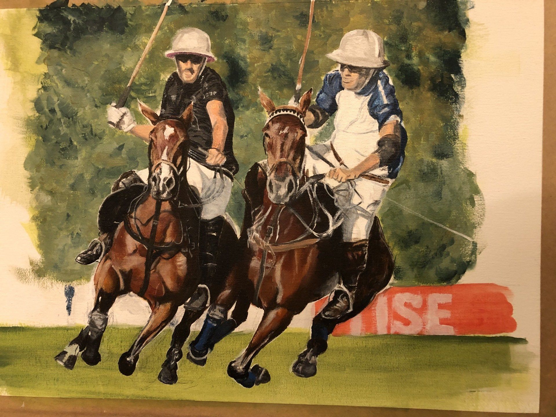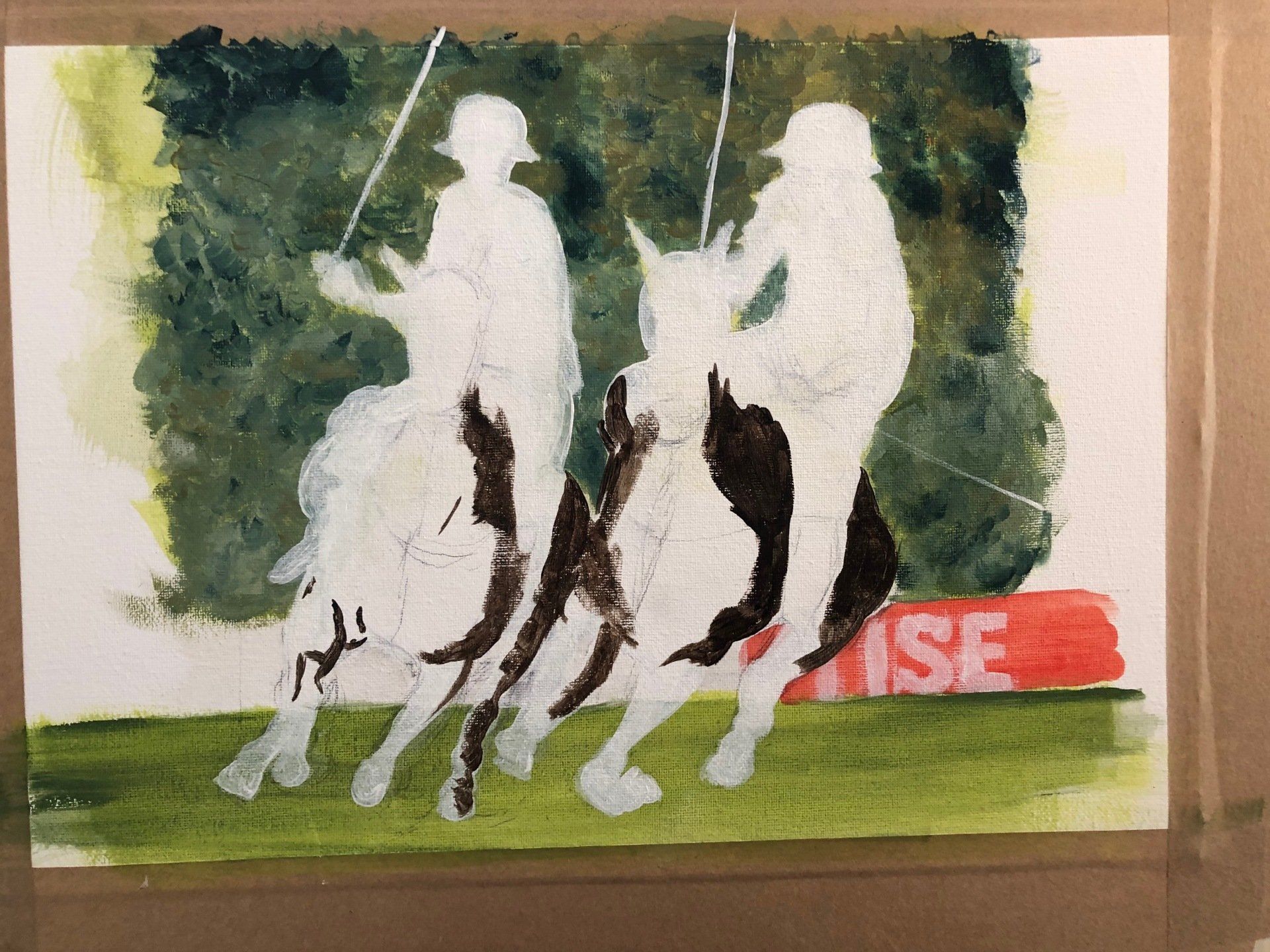 Cela a été frustrant cependant,comme je le concevais à l’origine, c’est une peinture carrée (voir les images ci-dessous), mais j’ai maintenant décidé qu’elle aurait un impact plus important en pleine largeur et qu’il aurait fallu partir de zéro. Le cheval de main gauche est plus avancé que celui de droite.